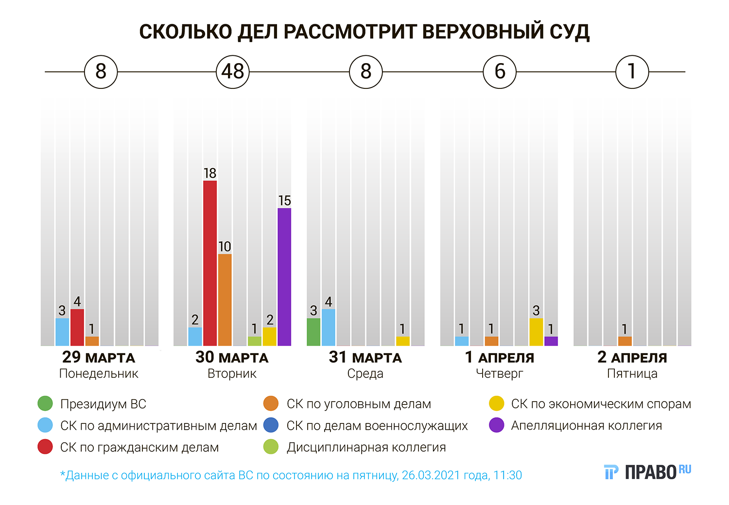 Апелляционная коллегия рассмотрит 16 дел, большинство – даже без проведения заседания. В коллегии по делам военнослужащих на этой неделе не назначено ни одного дела.