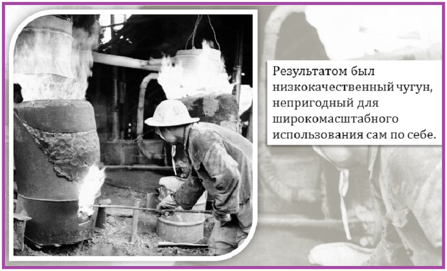 Для этого руководство КНР в 1958 г. приняло программу ускорения индустриализации, согласно которой каждая деревня должна была очиститься от всех элементов частной собственности, и самостоятельно производить не только тонны риса и другой сельхозпродукции, но и сдавать государству план по стале-и-чугуно-плавлению, производить внутри собственный сельхозинвентарь и машины.