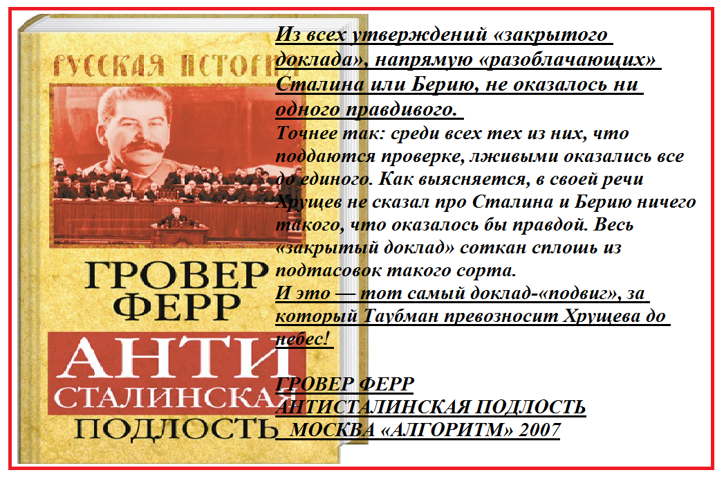 Спасибо, Ирина. Теперь мы знаем, что и Хрущёв, как и все враги Товарища Сталина, был англо-американским шпионом. Или его приспешником. Или тот шпион (Отто Куусинен) был приспешником Хрущёва. Или он (один из них, а может и оба) был (были) шпионом китайско-японским или австрийско-австралийским. А может это вообще клевета? А может оскорбление ветерана? А может и двоих (Сталина и Хрущёва)? А может и полная *****?