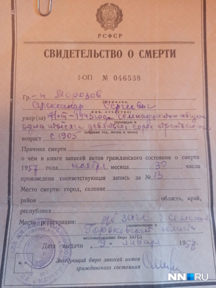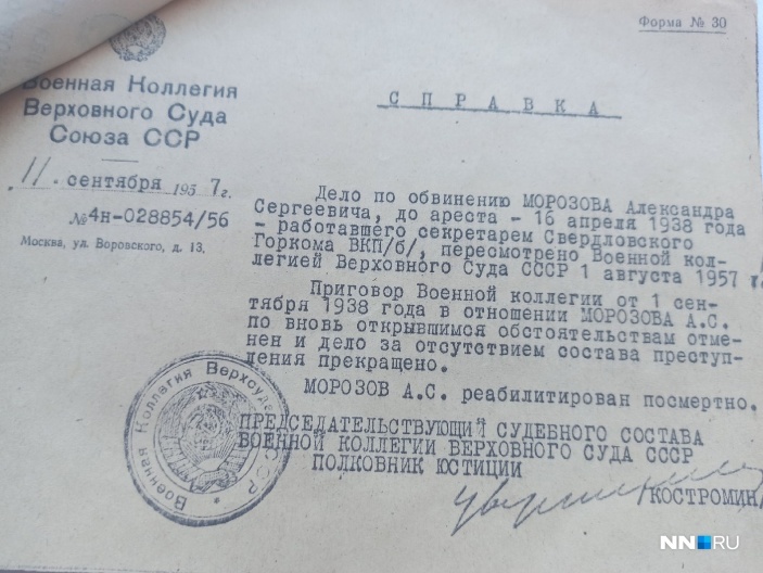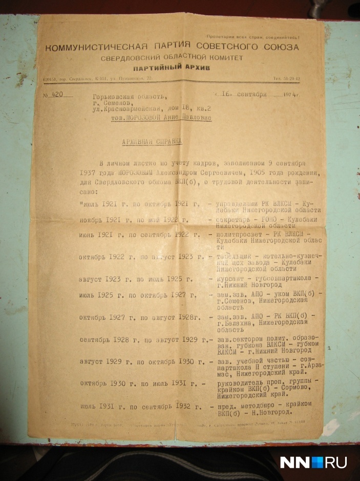 Годы жизни Александра Морозова удалось восстановить благодаря выпискам из табельных архивов КПСС, которые спустя годы после расстрела нижегородца получила его вдова