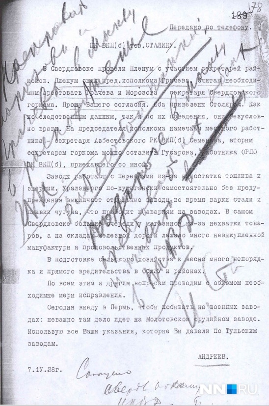 Это телефонограмма Андреева, переданная лично Сталину. Отметки карандашом написаны рукой вождя: «Направить Морозова и Грачева в Москву в распоряжение [неразборчиво]. По приезде в Москву арестовать их обоих и направить [зачеркнуто] в НКВД»