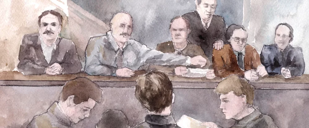 Товарищеский суд по "делу 4-х поэтов". Рисунок очевидца. Источник: diletant.media