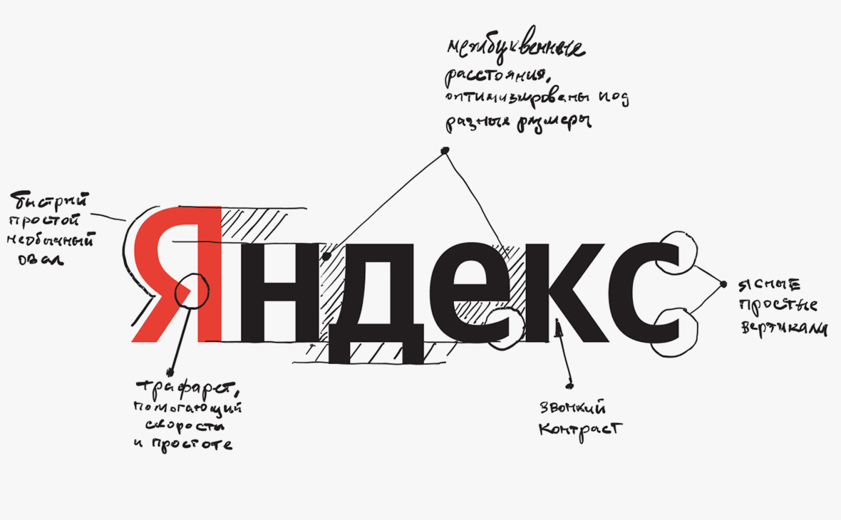 Первая версия фирменного стиля «Яндекса» была разработана специалистами Студии Лебедева в 1999 году, в 2004 году логотип был модернизирован. В 2008 году он был «переведен» на русский — вместо Яndex появился «Яндекс», а в 2010 году стал склоняться, к логотипу добавили фирменный шрифт, чтобы «склонять по правилам русского языка» — в «Яндексе», для «Яндекса» и так далее.