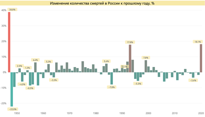 Как видим из графика, для России 2020 г. стал одним из худших по приросту числа смертей (+18,1%) с послевоенного времени. Этот показатель был выше только в 1947 г. – в период массового голода, тогда он составил 38,8%.