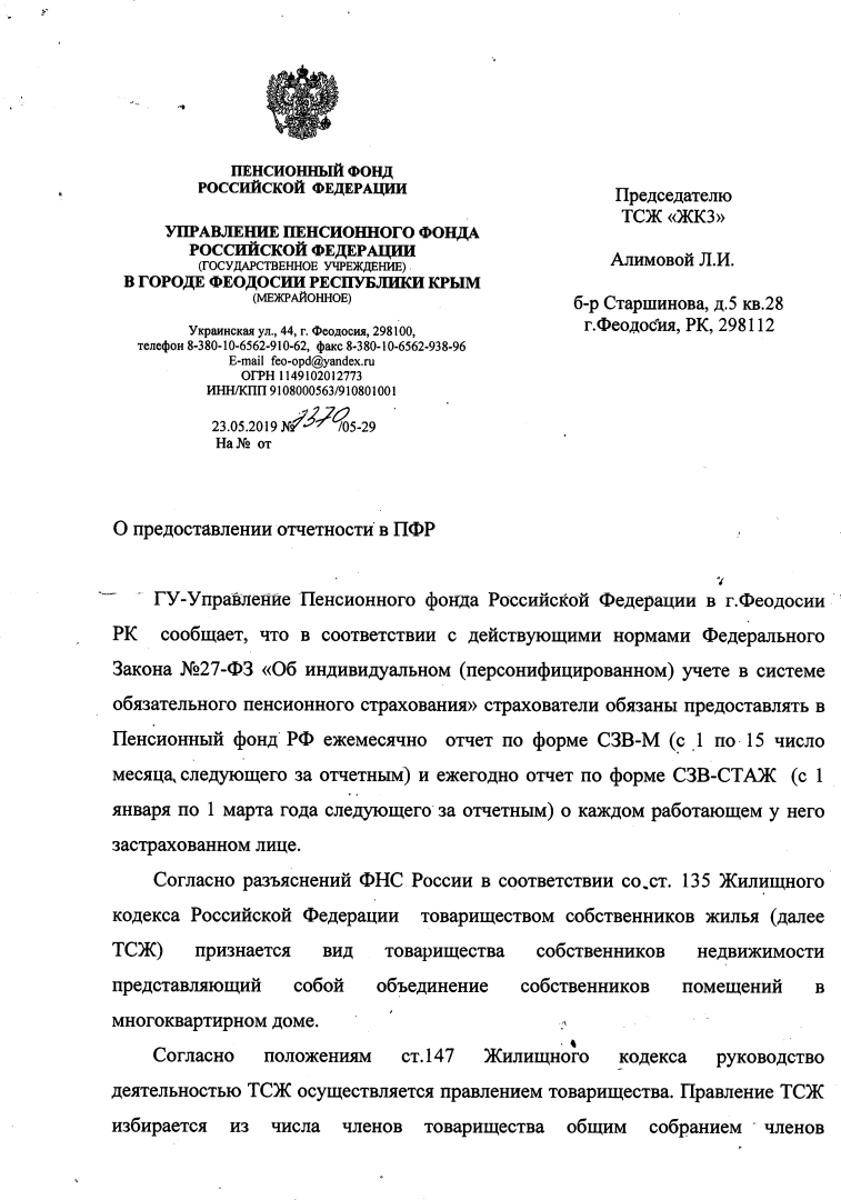 Таким образом, УПФ Феодосии было официально проинформировано о мотивированной правовой позиции ТСЖ "ЖК-3" относительно отсутствия оснований для предоставления сведений персонифицированного учета на Алимову Л.И. как на работающее застрахованное лицо, но полностью проигнорировало ответ ТСЖ “ЖК-3” - письмо от 05.06.2019 исх. № 61, не предоставив на это письмо мотивированный ответ.