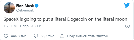 «SpaceX отправит настоящий Dogecoin на настоящую Луну», – объявил Маск в Twitter.