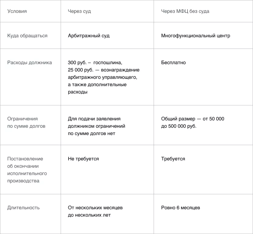 Внесудебная процедура банкротства возможна только при совпадении таких условий:1. В отношении должника окончено исполнительное производство в связи с тем, что у него нет имущества, на которое можно обратить взыскание, то есть на основании п. 4 ч. 1 ст. 46 Федерального закона от 2 октября 2007 года № 229-ФЗ «Об исполнительном производстве». Исполнительный документ возвращён взыскателю.2. После возвращения исполнительного документа не возбуждались другие исполнительные производства, которые не окончены или не прекращены на момент проверки МФЦ. Наличие исполнительных производств и основания их окончания можно проверить на сайте Федеральной службы судебных приставов или на Госуслугах.