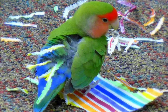 Чаще всего такую привычку можно заметить у попугаев-неразлучников. Эти крохи порой вырезают полоски бумаги длинной с собственное тело, причем трудиться они могут очень долго! Многие думают, что таким образом попугаи себя украшают, хвастаясь перед вами своими «обновленными перышками». Но на самом деле в этом ритуале совсем нет никакого тщеславия. Так птица прячет бумагу для будущего построения гнезда.