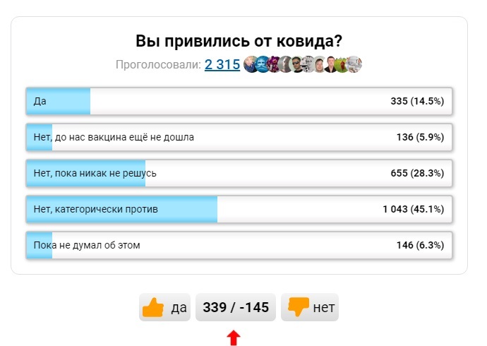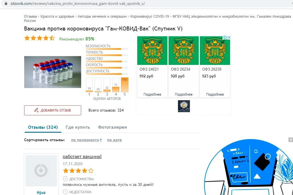 Возьмём, например, Отзовик. Народ рекомендует Спутник V. По крайней мере, 85% от всех отозвавшихся о Спутнике. Эта цифра не впечатляет?