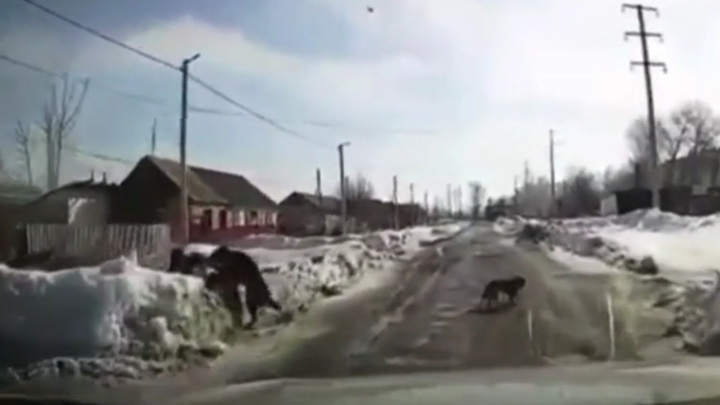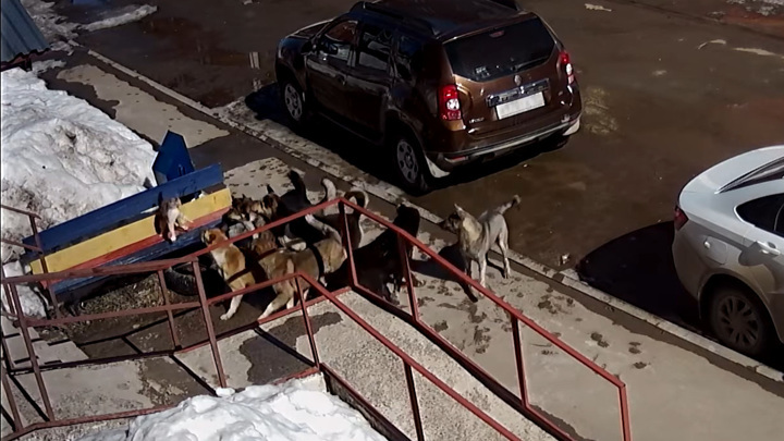 Услышав шум, люди бросили на стаю пакет из-под сока и криками прогнали агрессивную свору.