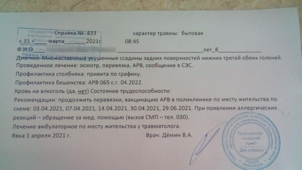 Пострадавшую Веру родители сразу отвезли в травмпункт. На ногах у ребёнка врачи диагностировали множественные укушенные ссадины. Медики обработали все раны и сделали прививку от бешенства.