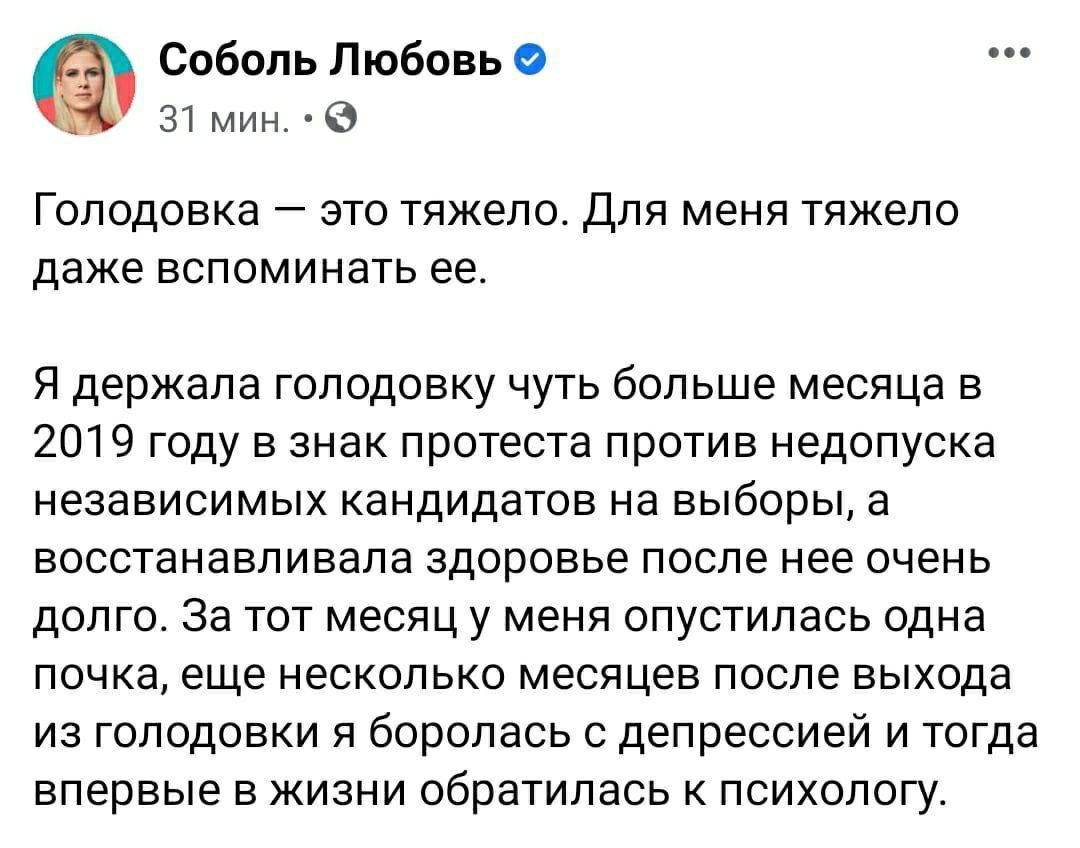 А Люба Соболь больше месяца не просто голодала, а ещё и бегала