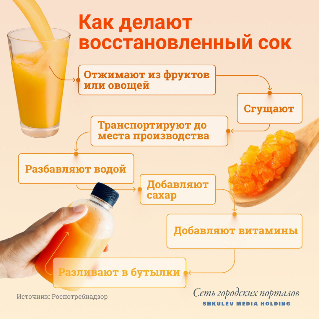 В Роспотребнадзоре отмечают, что самые полезные соковые продукты — это свежевыжатые соки, сделанные дома или в ресторане. В них сохраняются витамины, которые были в «исходниках». Но даже они не так полезны, как цельные овощи и фрукты — из-за обилия простых углеводов и низкого содержания клетчатки. Несколько менее полезны пастеризованные соки прямого отжима. Их делают из свежих овощей, фруктов или ягод путем механического отжима, а затем выдерживают при температуре 60–80 градусов: такой способ позволяет сохранить значительную часть полезных свойств свежевыжатого сока. Еще менее полезен сок восстановленный. В нем совсем мало витаминов, а чтобы сделать его полезнее, производители могут искусственно добавлять витамины и другие биологически активные вещества (и это будет уже обогащенный сок).