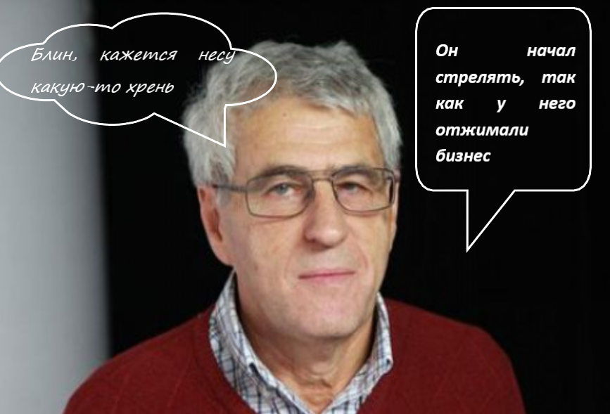 Оказывается, у «бедного пенсионера» «отжимали» бизнес. Да, да, Гозман так и написал «У человека отжимают бизнес». Оказывается к нему пришли не по делу о незаконном обороте оружия, а «отжимать бизнес». Оказывается «у человека от отчаяния и безнадежности что-то щелкает в голове, и он открывает стрельбу».