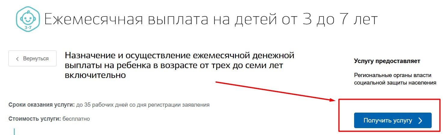 - Нажмите на кнопку “Получить услугу” и заполните заявление на получение денежной выплаты.