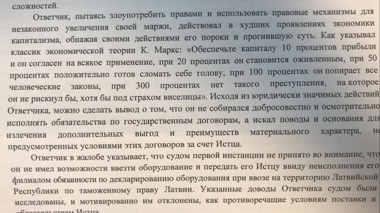 «Ответчик, пытаясь злоупотребить правами и использовать правовые механизмы для незаконного увеличения своей маржи, действовал в худших проявлениях экономики капитализма, обнажая своими действиями его пороки и прогнившую суть. Как указывал классик экономической теории К. Маркс: «Обеспечьте капиталу 10 процентов прибыли и он согласен на всякое применение, при 20 процентах он становится оживленным, при 50 процентах положительно готов сломать себе голову, при 100 процентах он попирает все человеческие законы, при 300 процентах нет такого преступления, на которое он не рискнул бы, хотя бы под страхом виселицы». Исходя из юридически значимых действий Ответчика, можно сделать вывод о том, что он не собирался добросовестно и осмотрительно исполнять обязательства по государственным договорам, а искал поводы и основания для излечения дополнительных выгод и преимуществ материального характера, не предусмотренных условиями этих договоров за счет Истца».