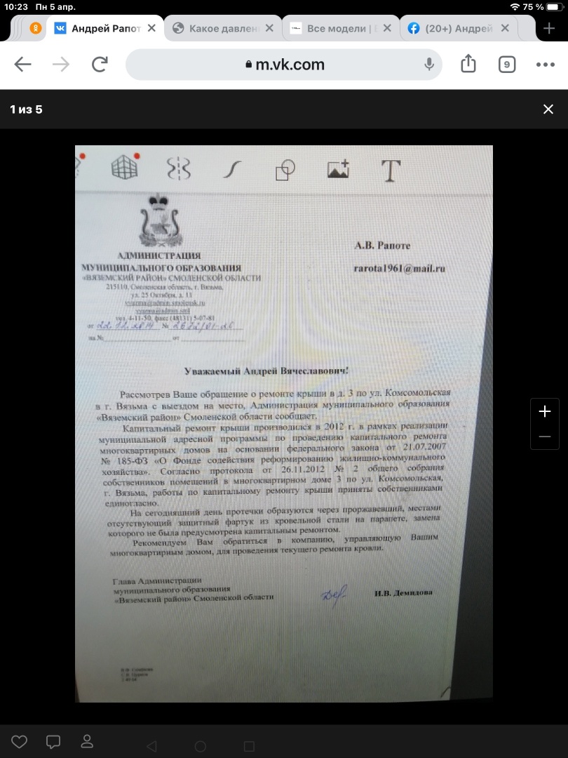 Я в 2015 году был на приёме у главы Вяземского района Демидовой по поводу практически на 50% проржавевшей кровли на мансарде дома, которую "забыли" заменить во время капитального ремонта, находящейся над комнатой, где я живу, а так же, что мансарда разрушается.