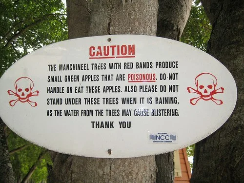 Манцинелла опасна всем. В ней ядовиты и кора, и плоды, и листья, и цветы, и даже роса, падающая с веток. В свое время коварное деревцо унесло не одну сотню жизней испанских конкистадоров, пиратов и простых европейских моряков, которые попытались утолить голод и жажду его ароматными сладкими плодами. Манцинелла продолжает убивать до сих пор, ведь не всегда она обнесена забором и предупреждающими об опасности табличками. Случается, страдают туристы, причем не только те, которые беспечно попробовали смертельные «яблоки», но и те, которые отдыхали в тени раскидистой кроны или пережидали под ней дождь.