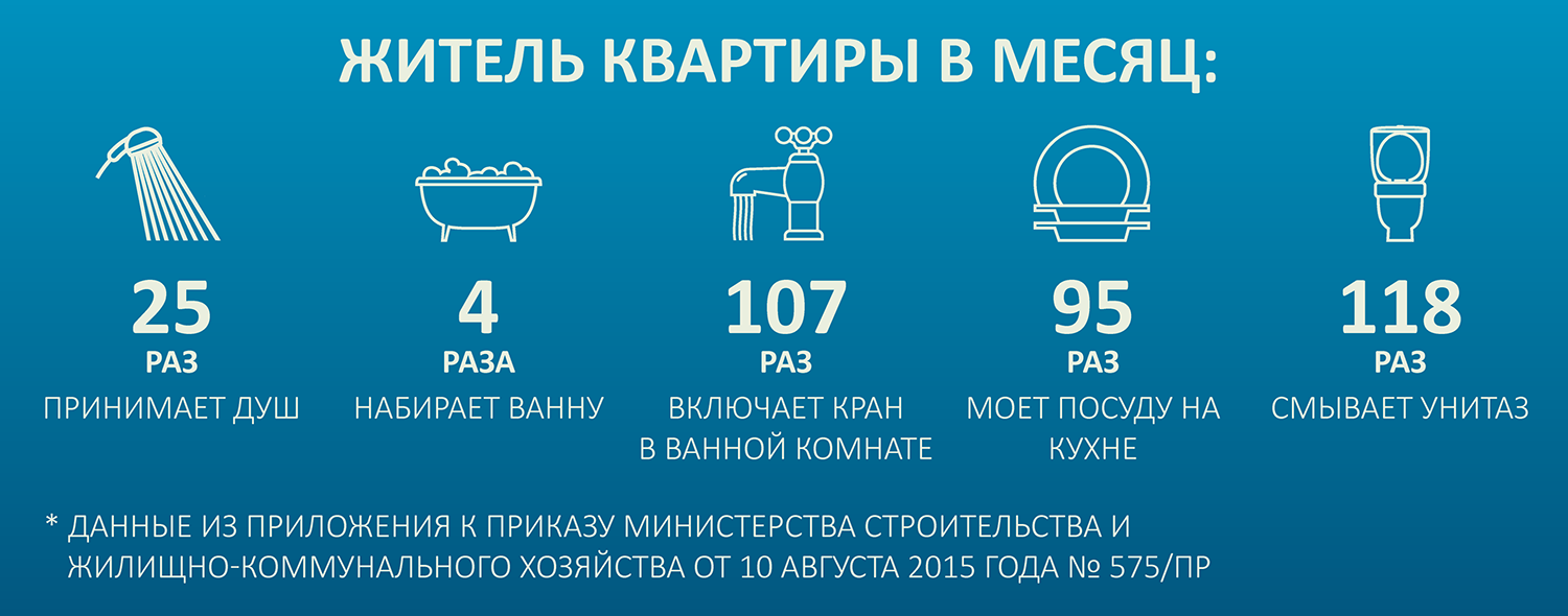 Плата за коммуналку может рассчитываться по показателям счетчиков, средним значениям, нормативам. Нормативы потребления коммунальных услуг с учетом среднемесячных данных определил Минстрой. По его сведениям, среднестатистический житель квартиры в России принимает душ 25 раз, а ванну набирает четыре раза в месяц.