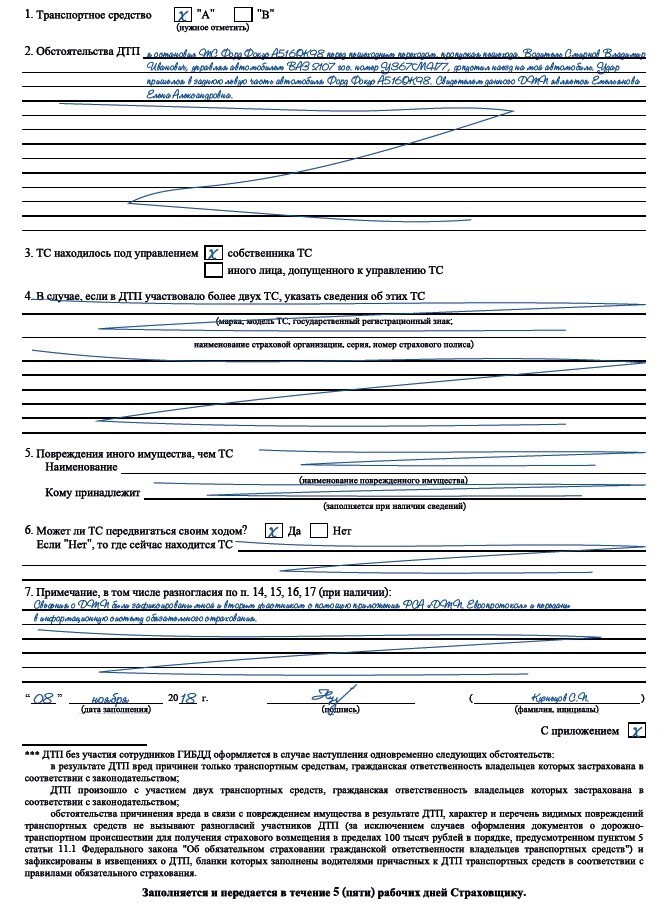 -при наличии разногласий в обстоятельствах причинения вреда в связи с повреждением имущества в результате ДТП, характере и перечне видимых повреждений транспортных средств, в п.18 Извещения о ДТП ставится соответствующая отметка, а на оборотной стороне Извещения, в п.7 «Примечание» указывается суть разногласий.