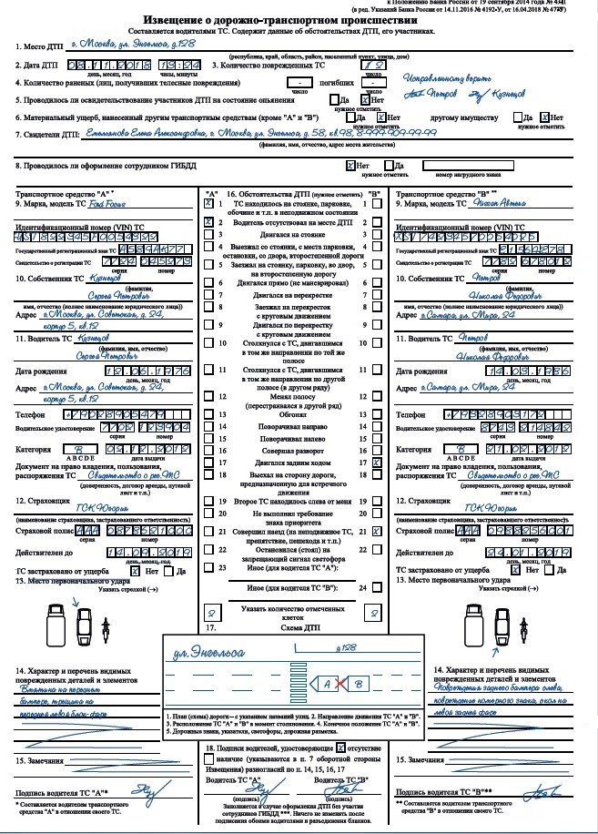 ДТП оформляется в рамках «Европротокола». То есть путем самостоятельного заполнения Извещения о ДТП, прилагаемого к полису ОСАГО, в соответствии с прилагаемыми к нему правилами заполнения.