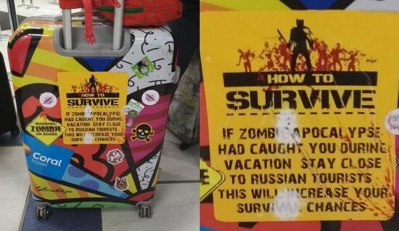 Сеть облетела фотография чемодана с памяткой, в которой указывается, что в случае зомби-апокалипсиса следует держаться поближе к русским туристам, так как это повысит шанс на выживание.