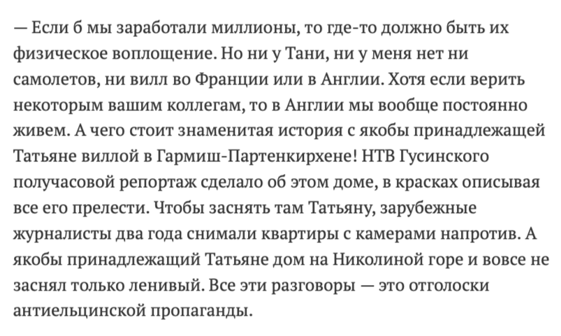 В 2011 году Юмашев уверял корреспондента «Московского комсомольца»: