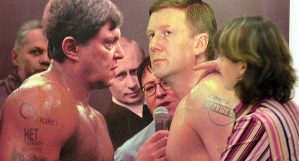 1999 год. Вторая чеченская война. «Яблоко» теряет электорат из-за антивоенной позиции Явлинского. «В Чечне возрождается российская армия. А Явлинский всаживает нож в спину российской армии» — произносит Чубайс знаменитую фразу.