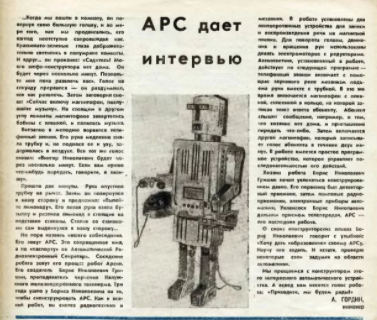 Его робот, получивший имя АРС (автоматический робот-секретарь) и любовное прозвище Арсик, умел немыслимые для тех лет (средина 60-х годов прошлого века!) вещи, и в его обязанности входило:
