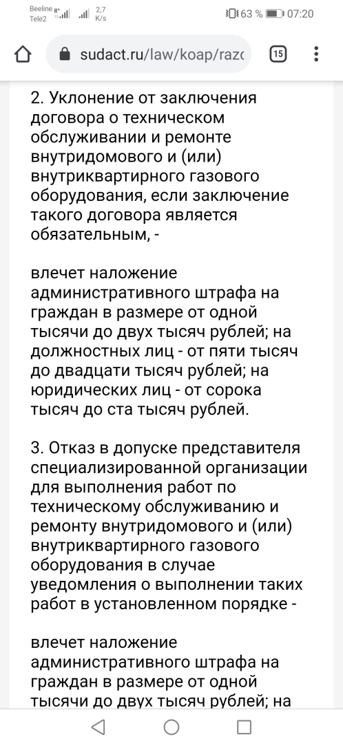 Ольга, Новопокровская. Квартира, о которой я пишу, досталась мне по наследству, никак от неё не избавлюсь! А живу я в своём доме. Так вот ко мне в дом приходили с проверкой. Проверили, написали акт, что у меня котёл установлен не по правилам. Я расписалась в нём и всё. Прошло уже 4 года, никто мне штрафов не преподносит! Поэтому вам и написала, что могут только порекомендовать! Договор здесь муж заключил, так как дом на нём. А вот в квартире договор я не заключаю с 2015 года. Есть законы, на которые газовая служба ссылается, когда заставляют заключить договор. Я читаю эти законы и вижу, что есть пункты, которые не обязывают эти договоры заключать, а раз есть, то я на них и держусь. Был один договор конкретно про договор, в котором надо заключать договор, описывались размеры штрафов, но в конце этого закона было написано: договор заключается, если он нужен. Потом его видоизменили. Но тоже появилась другая приписочка, если потребитель не может прийти в газовую службу, то газовая служба может прислать договор по почте. Вот тогда и надо заключить этот договор, т.е. расписаться в нём, на один год. А потом опять по - новой! Также, если идут какие - то бумажки с угрозой отключения газа, то опять же по закону: они обязаны за 2 недели до отключения прислать заказное уведомление со сроками прихода для отключения. Вы можете с любой газовой компанией заключить договор на обслуживание за эти две недели! Только читайте договор все пункты, особенно что они обязаны делать при обслуживании вашего оборудования и какие виды работ входят в обслуживание, тогда они вас не смогут обмануть! Вы можете им выставлять претензии по неполному обслуживанию.
