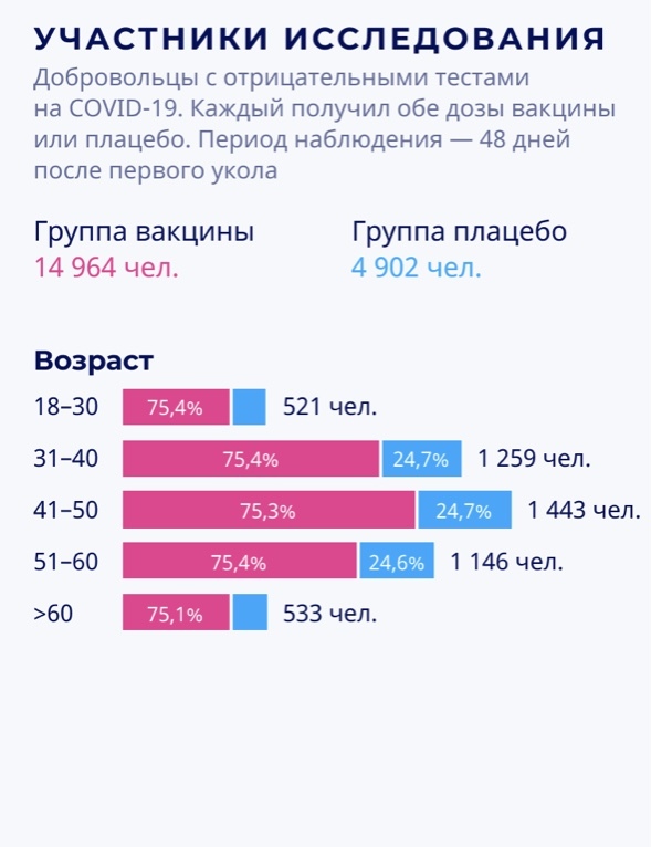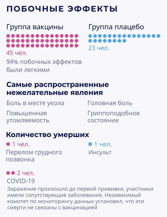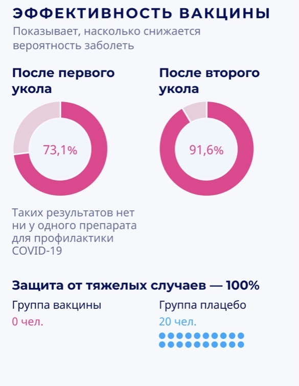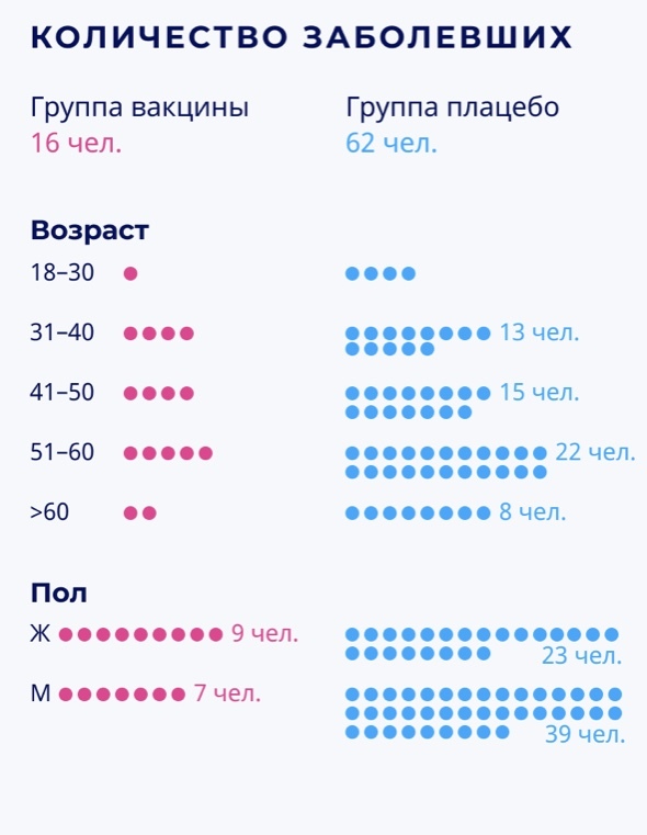 Ни одна из разрешенных к использованию вакцин в мире не защищает от инфекции на сто процентов. Всегда есть небольшое число людей, которые заразились COVID-19 после прививки. Играет роль сочетание множества факторов, в том числе случайных. Так, из 21 тысячи участников испытаний "Спутник V" 97 случаев заражения произошло в течение 21 дня после первой дозы. При этом в группе вакцинированных не было ни одного среднего и тяжелого течения болезни, что говорит о высокой защите.