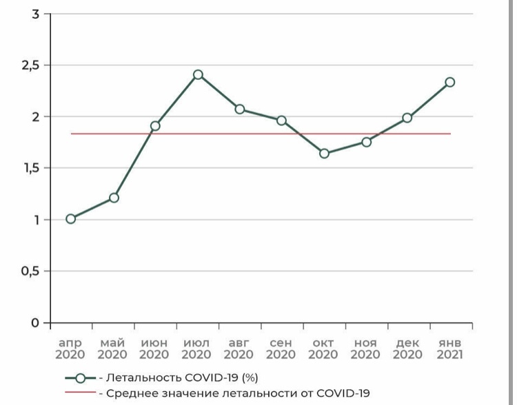 Синий график — летальность COVID-19 в процентах. Красная линия — среднее значение летальности.