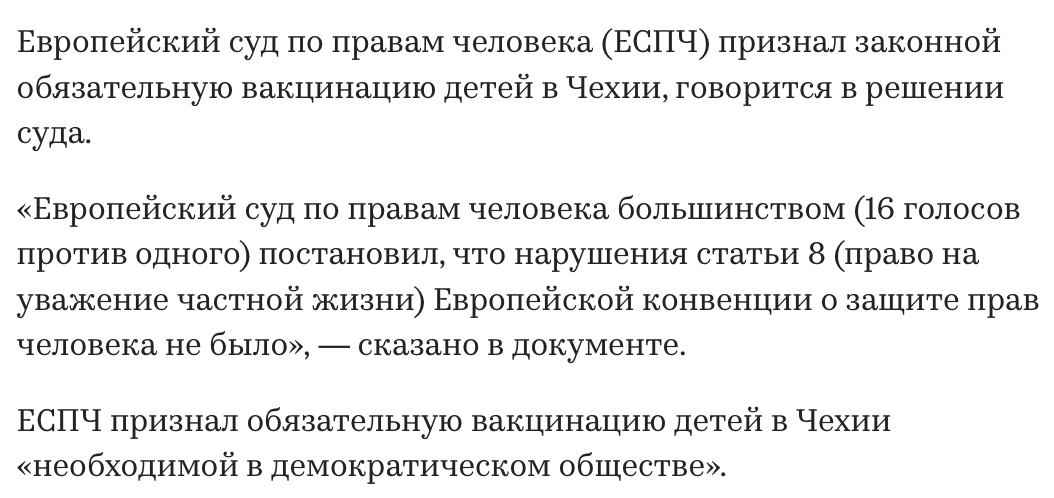 В свою очередь, ЕСПЧ признал законной обязательную вакцинацию детей в Чехии. Именно об этом сказано в решении суда.