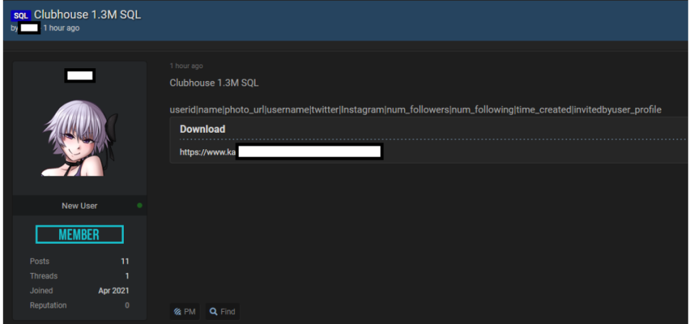 CyberNews сообщила, что база данных SQL, содержащая 1,3 миллиона записей пользователей Clubhouse, бесплатно просочилась на популярный хакерский форум.