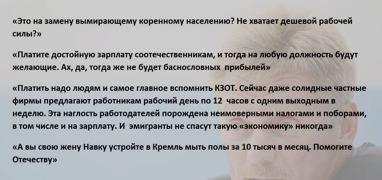 Да этого пургогона кто только уже на... не посылал, даже президедушка... А вот с нехваткой мигрантов т.е. гастарбайтеров отдельный вопрос, ну трудятся же у нас Д. Козак, О. Голодец, Д. Мантуров, М. Топилин, Г. Каламов, А. Талыбов, А. Лавров, М. Керимов, Н. Осиенко, А. Турчак, В. Пономарёв, Б. Невзоров, А. Клишас, А. Каноков, Е. Мизулина, А. Бабаков, С. Керимов, А. Левинталь, С. Лисовский, В. Жириновский, И. Лебедев (его сын), М. Берулава, И. Роднина, Д. Кравченко, А. Жуков, А. Голушко, Г. Аникеев, А. Прокопьев, Ай. Хайруллин, Л. Симановский, Р. Курбатов, М. Щапов, А. Кравец, Г. Балыхин, Ел. Бондаренко, В. Фетисов, В. Никонов, Н. Валуев, А. Ремезков, Н. Борцов, М. Ликсутов, В. Ефимов, М. Хаснуллин, А. Бочкарёв, А. Елисеев, О. Волков, А. Александров, А. Цибин, С. Брилев, К. Эрнст, Ек. Андреева, В. Ру. Соловьев... И это только те гастарбайтеры высшего звена и их лакеи про которых можно узнать в открытом доступе... А есть же ещё вагон и маленькая тележка губеров, мэров и прочая-прочая управленцев, которые работают в России, а все нажитое везут "за бугор", чаще всего в страны НАТО. Вон из одних только отпрысков г-на Пескова можно укомплектовать отделение солдат НАТО! Спасибо им спасителям и патриотам России!