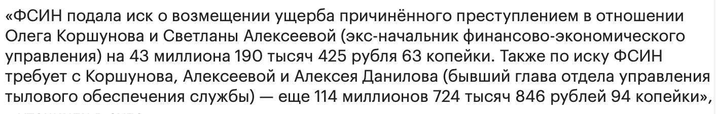 Знаете ли вы, что Федеральная служба исполнения наказаний (ФСИН) России просит Кузьминский суд города Москвы взыскать более ₽158 млн с экс-замглавы ведомства Олега Коршунова и еще двоих осужденных сотрудников ФСИН?