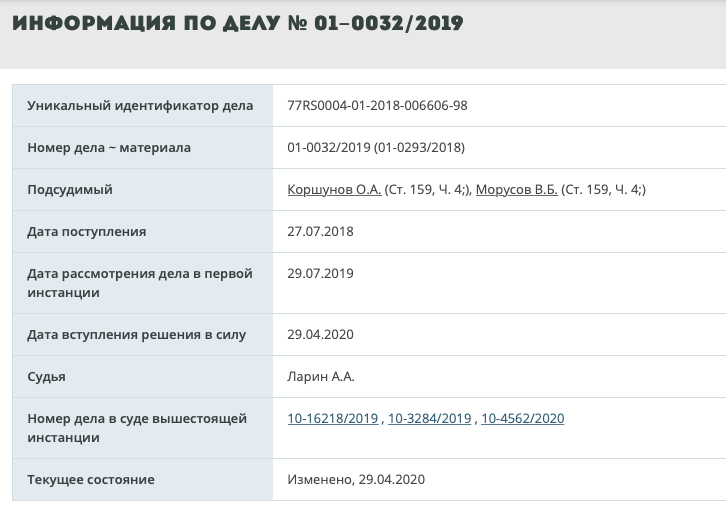 К этому моменту в отношении Олега Коршунова возбуждено шесть уголовных дел. Свою вину он не признал ни по одному из обвинений.