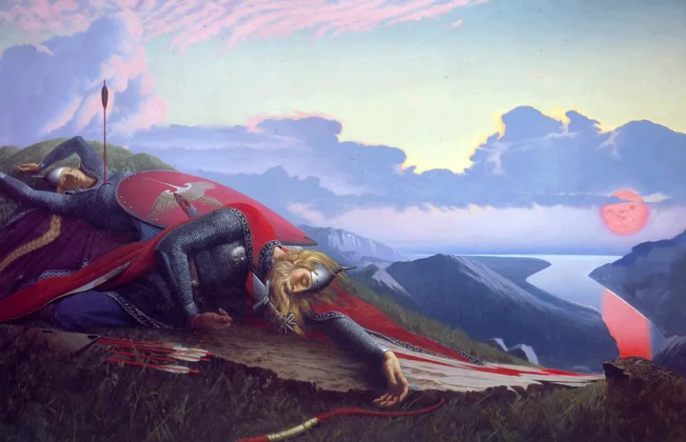 Такая фраза задела его честь — и он вызвал жену на поединок. Каждый должен был попасть стрелой в серебряное кольцо на голове соперника. Поляница попала, а вот Дунай Иванович убил жену. Узнав, что она носила в утробе младенца, богатырь от горя вонзил в себя копье. От его крови родилась Дунай-река, а от крови Настасьи Королевичны — река Непра.