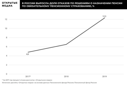 Как видим из графика, доля отказов в назначении пенсии в 2018 году была почти в 2 раза ниже, чем в 2019 году, в котором и началась пенсионная реформа. В 2019 году ПФ вынес 12,3% отрицательных от общего количества решений по назначению пенсий, а в 2018 году их было всего 6,5% (Подробнее ➤).