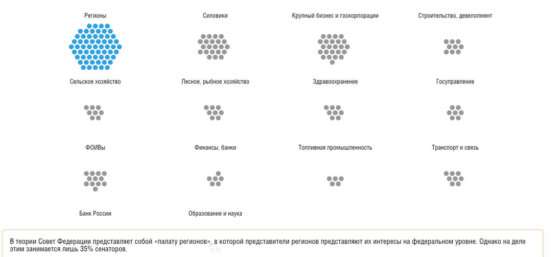 О лоббизме и продвижении интересов на уровне сенаторов важно говорить, потому что Совет Федерации представляет собой «палату регионов», в которой представители регионов продвигают их интересы на федеральном уровне. Однако на деле этим занимается лишь 35% сенаторов. Как показало исследование «Трансперенси Интернешнл - Россия», сенаторы часто продвигают инициативы, никак не связанные с потребностями регионов, которые они представляют.