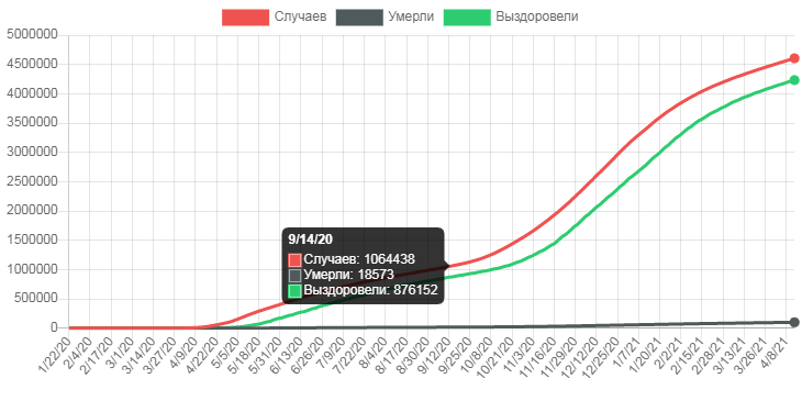 На сегодняшний день (14.04.2021) ситуация с Ковид-19 в стране следующая: