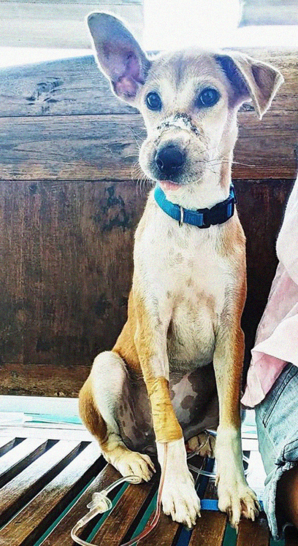Несмотря на очень плохое физическое состояние, главной проблемой Мо была её морда, которую ловцы собак перемотали скотчем. Клейкая лента прервала кровообращение, и её плоть отмирала. Собаку срочно доставили в хирургию, где ей аккуратно зашили морду с использованием трансплантации кожи.