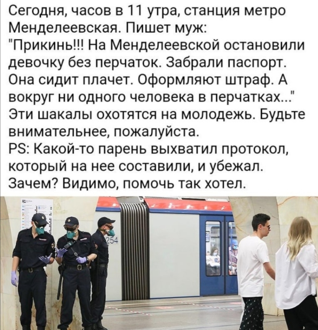 Дело в том, что в московском метро постоянно проходят выборочные облавы на пассажиров без перчаток и масок. Свидетели событий утверждают то, что особо циничные контролеры орудуют на станции Менделеевской.