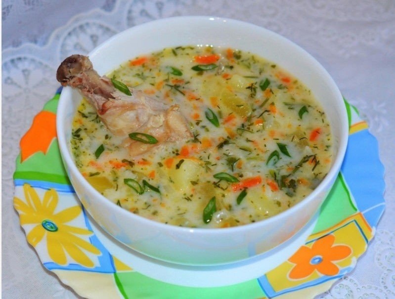 4. В бульон добавить картофель. Добавить лук и морковь. Варить 5–7 минут. Затем добавить мясо, варить до готовности картофеля. Добавить сыр, хорошо перемешать и убрать с огня. При подаче посыпать зеленью.
