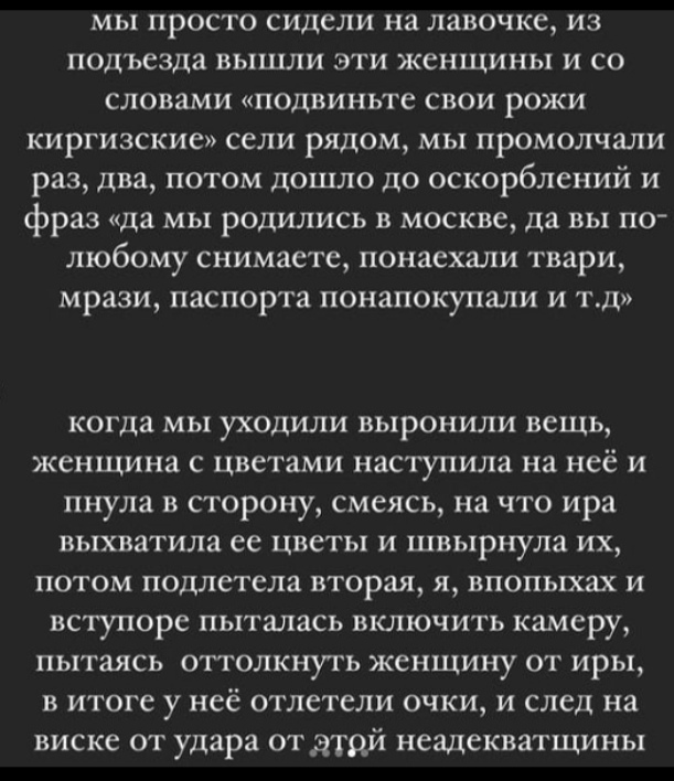 Потерпевишие, а именно уроженки Бурятии Сарюна и Ирина, спокойно присели отдохнуть на скамейку во дворе дома в центре Москвы, но вдруг услышали - подвиньте свои рожи киргизские! - от двух взрослых женщин, которые были в нетрезвом состоянии.
