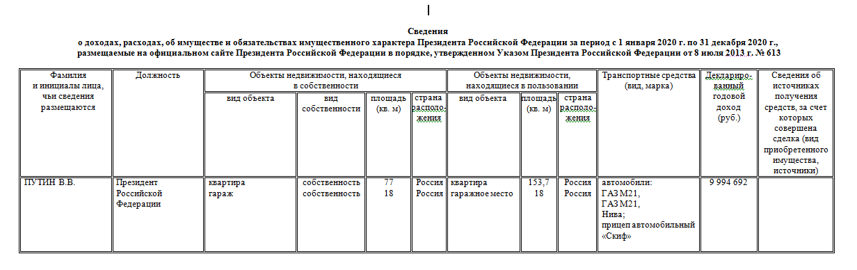 Опубликована декларация о доходах Путина за 2020 год. Путин заработал в 2020 году всего 10 млн рубле
