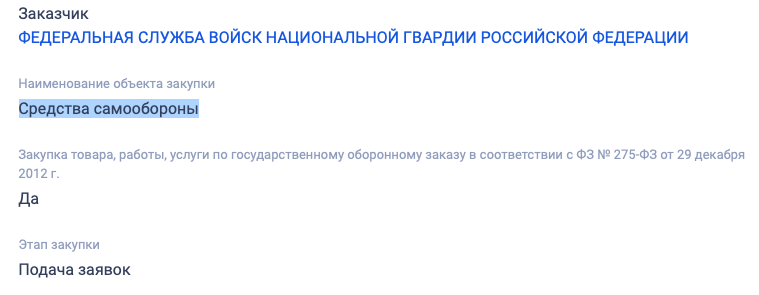 Хочется упомянуть, что данная закупка будет вдвое больше, чем в прошлом году. Поставлены перцовые баллончики должны будут до 1 августа этого года в войсковую часть Росгвардии в подмосковной Балашихе.