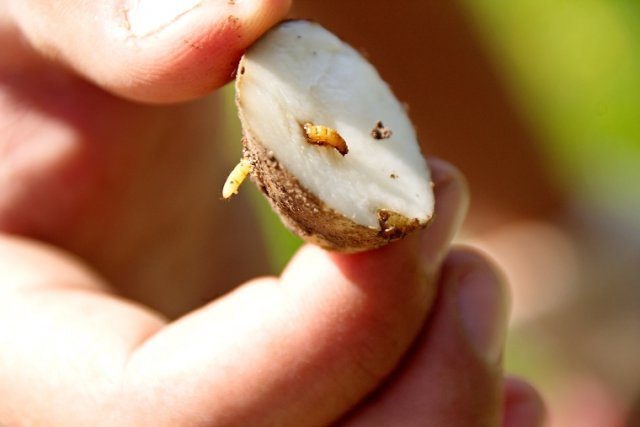 В качестве приманки для проволочника по огороду раскладывают, а точнее закапывают на глубину 7-10 см ломтики свеклы, моркови или картофеля. В каждый ломтик втыкают деревянные палочки, чтобы легче найти ловушку (на 1 кв.м их необходимо 3 штуки). Спустя несколько дней овощные ломтики выкапывают вместе со скопившимися на них вредителями и сжигают. Обработка, как правило, проводится за 10-15 дней до посадки картошки.