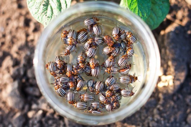Если участок посадки не слишком большой, можно собирать личинок и взрослых особей вручную. Однако это требует времени и не дает никакой гарантии против повторного поражения. Давить жуков в междурядье не стоит. Так вы лишь вдавите вредителя в почву, откуда он легко выберется и продолжит лакомиться вашей картошкой. Лучше собирать насекомых в банку с крепким соляным раствором.