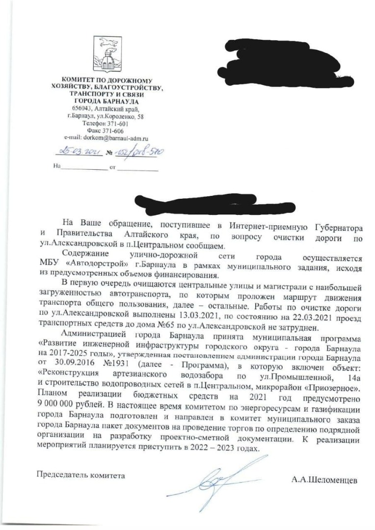 В марте 2021 года мэрия ответила одной из жительниц Центрального, что водопровод в Приозёрном всё-таки будет (копия документа есть в распоряжении редакции). У города есть постановление "Развитие инженерной инфраструктуры городского округа – города Барнаула на 2017-2021 годы". И с 2020 года в планы внесли реконструкцию водозабора в Центральном и подключение к нему домов в Приозёрном. К 2021 году, следует из ответа, "направлен пакет документов на проведение торгов по определению подрядной организации, на разработку проектно-сметной документации". На простом языке это значит, что в администрации пока даже не утвердили, кто будет разрабатывать проект прокладки сетей. И уж тем более, кто их будет строить.
